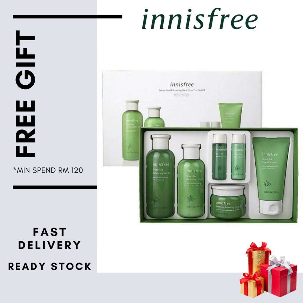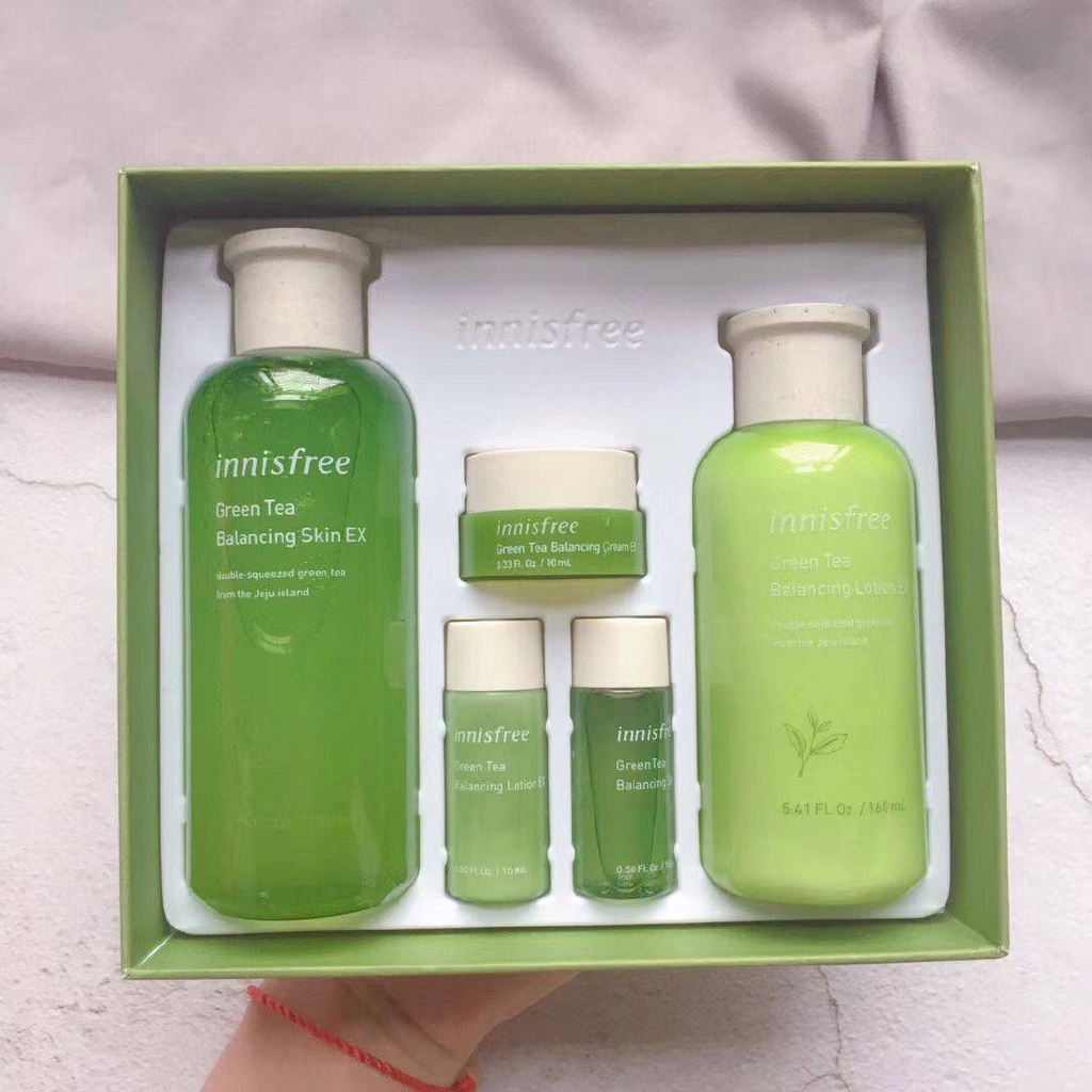 1x green tea balancing skin ex 200ml 1x green tea balancing lotion ex 160ml 1x green tea balancing skin ex 15ml 1x green tea balancing lotion ex 15ml 1x green tea balancing cream ex 10ml beauty green tea your new world of hydration after 10 years of dedicated research by innisfree in the pristine island of jeju beauty green tea leaves has been cultivated purely for skin.